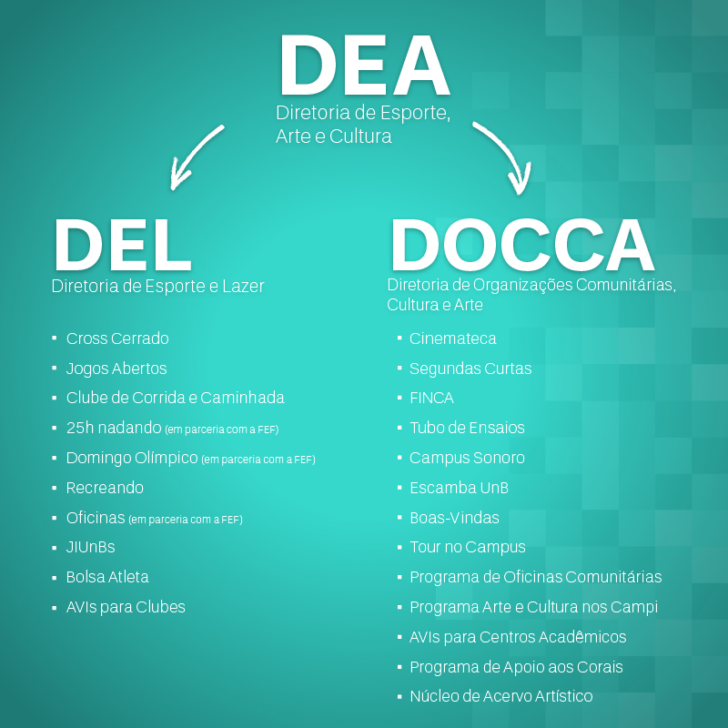 A Diretoria de Esporte, Arte e Cultura (DEA), vinculada ao Decanato de Assuntos Comunitários (DAC), acaba de passar por uma mudança estrutural: agora, são duas novas diretorias. A configuração atual, em que a DEA deixa de existir, tem o fim de atender de forma mais criteriosa e ampliada cada uma das seguintes áreas: Organizações Comunitárias, Cultura e Arte de um lado (DOCCA); e Esporte e Lazer de outro (DEL). “Não se trata de um encerramento das relações, mas uma oportunidade de ampliar os horizontes das duas diretorias. As perspectivas de parcerias restam as mesmas, uma vez que continuamos partilhando de valores semelhantes, como o da formação cidadã dos nossos estudantes”, explica Priscila Santos Calgaro, diretora em exercício da DOCCA.