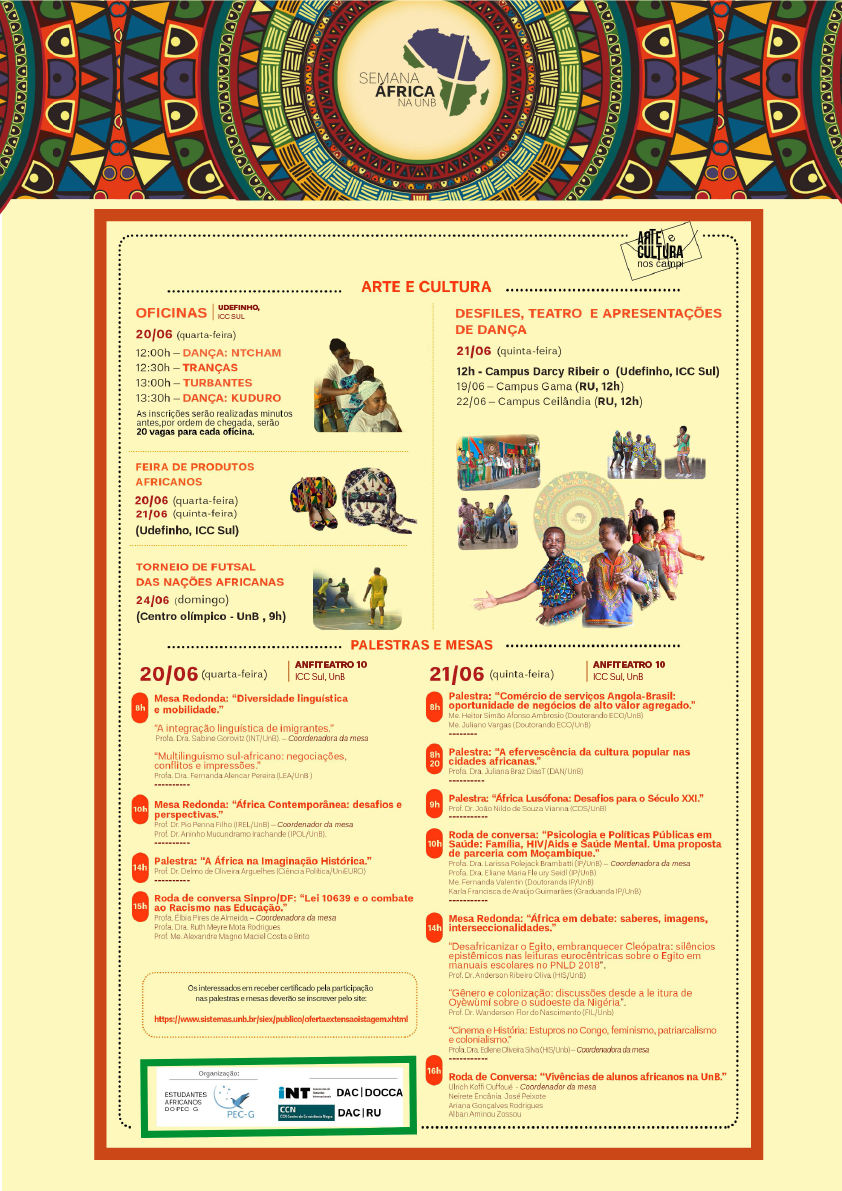 A Universidade de Brasília irá receber uma ampla programação de eventos artísticos que se iniciam nos dias 20 e 21 de junho de 2018, com a Semana da África. As atividades previstas receberão fomento e apoio de produção por meio do edital Arte e Cultura nos campi, lançado pela Diretoria de Organizações Comunitárias, Cultura e Arte, do Decanato de Assuntos Comunitários, Culturas e Arte (UnB/DAC/DOCCA). Foram selecionados para execução 23 projetos, percorrendo os quatro campi da UnB: Darcy Ribeiro, Planaltina, Gama e Ceilândia.