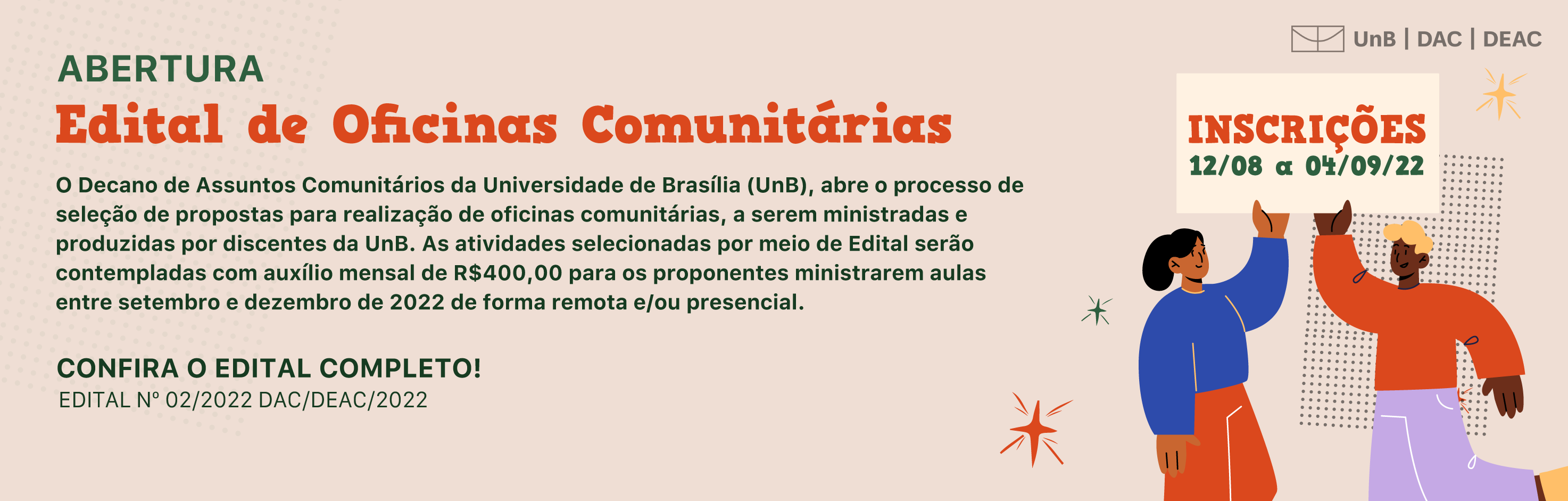 As inscrições para as Oficinas Comunitárias de 2022 foram prorrogadas até 4 de setembro!!! Venham compartilhar saberes com toda comunidade universitária!